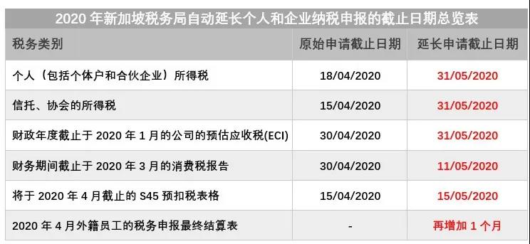 2020年4月4日,新加坡稅務(wù)局(IRAS)根據(jù)COVID-19情況的最新措施,作為對納稅人的支持,新加坡稅務(wù)局(IRAS)自動延長個人和企業(yè)納稅申報的截止日期如下: